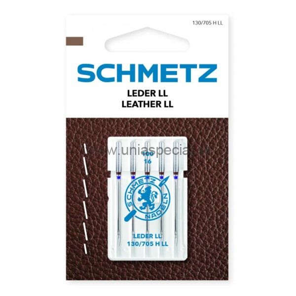 Ihly SCHMETZ - 130/705H LL na šitie kože pre domáce šijacie stroje. Nepoužívajte na pleteniny a tkaniny. Balenie: 5 ks (5x100).
