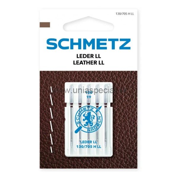 Ihly SCHMETZ - 130/705H LL na šitie kože pre domáce šijacie stroje. Nepoužívajte na pleteniny a tkaniny. Balenie: 5 ks (5x120).