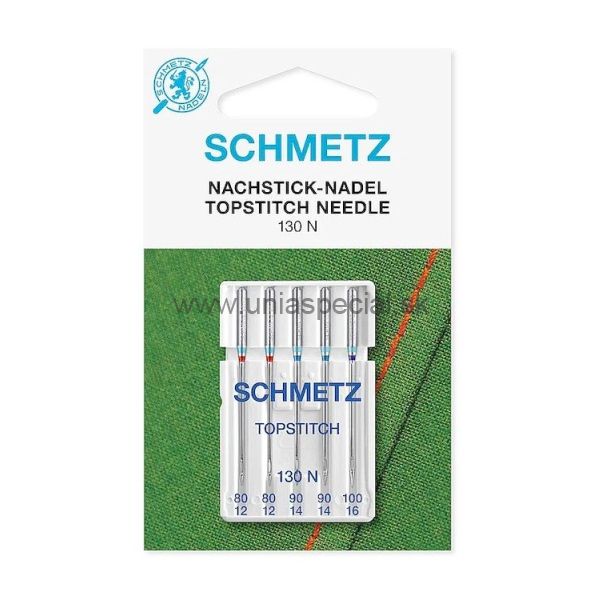 Ihly quiltovacie SCHMETZ - 130 N topstitch pre domáce šijacie stroje. Balenie: 5 ks (2x80, 2x90, 1x100).
