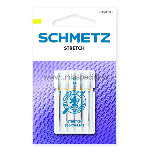 Ihly SCHMETZ Stretch - 130/705H-S pre domáce šijacie stroje. Balenie: 5 ks (5x90). Ihly pre elastické materiály, stretch, lycru. Stretchové ihly (H-S) majú špeciálne skosenie, ktoré zabraňuje preskakovaniu stehov v prípade napnutého materiálu. Pre úplety, plavky, fleece, syntetický semiš.