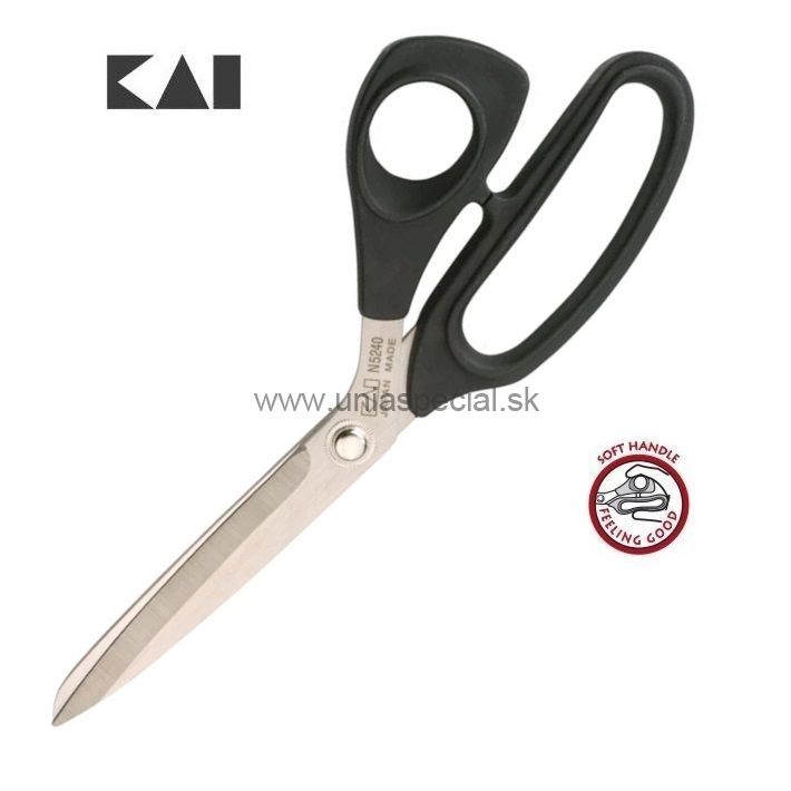 Krajčírske nožnice KAI 9 1/2" (240 mm). Veľké univerzálne nožnice pre pohodlné strihanie materiálu. Ergonomicky tvarovaná mäkká rukoväť.