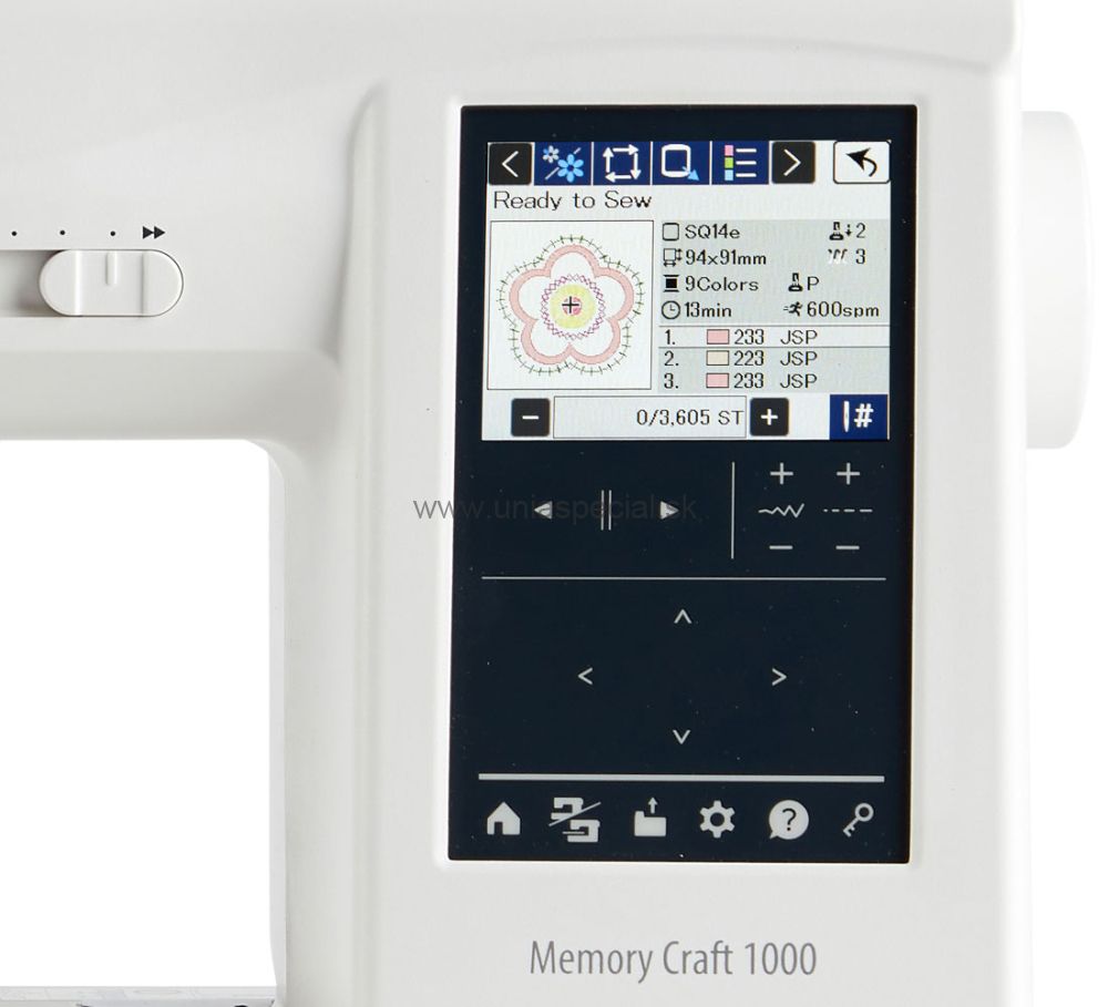 - V základnej výbave má stroj predinštalovaných 241 vzorov + 11 typov písma (vrátane 10 európskych fontov obsahujúcich písmená s diakritikou, a tiež mikro gotické písmo ideálne pre malé písmo)