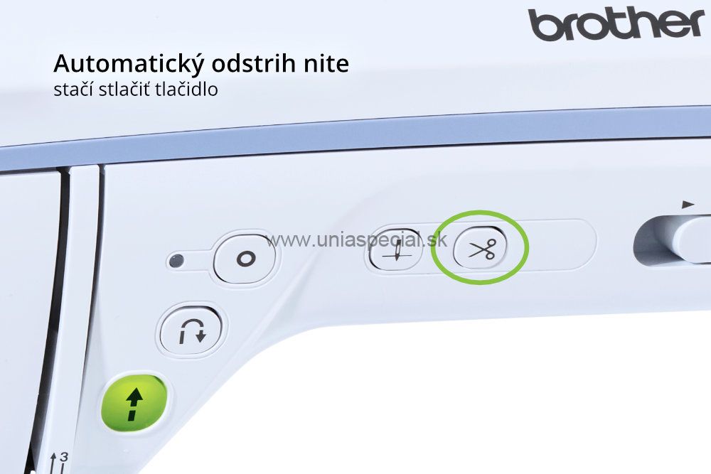 Chcete šiť bez pedálu? Žiadny problém - s nastaviteľným ovládačom regulácie rýchlosti je to hračka - stačí stlačiť tlačítko Start/Stop a šiť. Táto funkcia vám tiež uľahčí navíjanie cievok spodnej nite a šitie gombíkových dierok. Už nebudete musieť stúpať na pedál. Šitie urýchľuje aj funkcia automatický odstrih nite - kedy po automatickom zapošití stroj sám prevlečie nite na rubovú stranu látky a tam nite odstrihne asi na 2 cm.