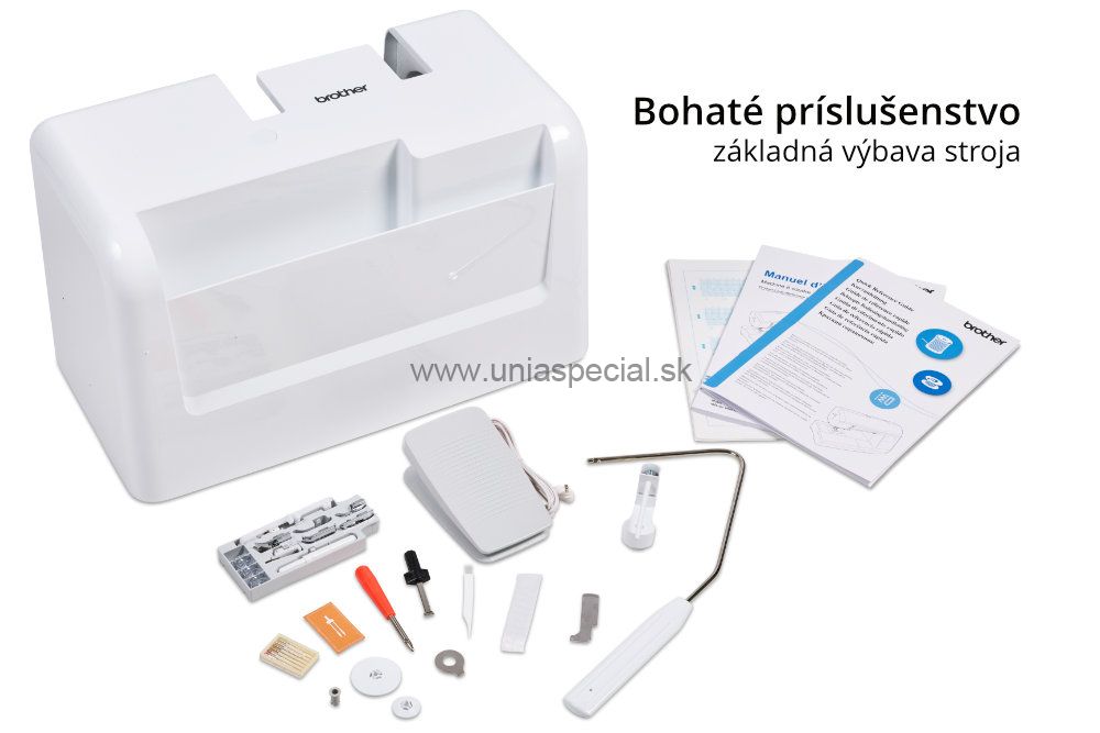 Samozrejmosťou je voľné rameno pre šitie nohavíc a rukávov, robustné celokovové telo stroja, ergonomicky umiestnené tlačítka, možnosť vypnutia zúbkov podávania pri plátaní a quiltovaní, LED osvetlenie, rýchla výmena pätiek jednoduchým nacvaknutím. Brother používa moderné tiché rotačné chapače, ktoré sa jednoducho čistia, niť založíte rýchlo a počas šitia cez priehľadnú krytku vidíte, koľko nite vám ešte zostáva na cievke. V priehradke na príslušenstvo nájdete praktický organizér na pätky, takže máte všetko pripravené.