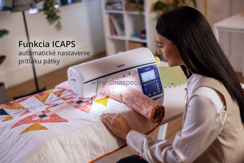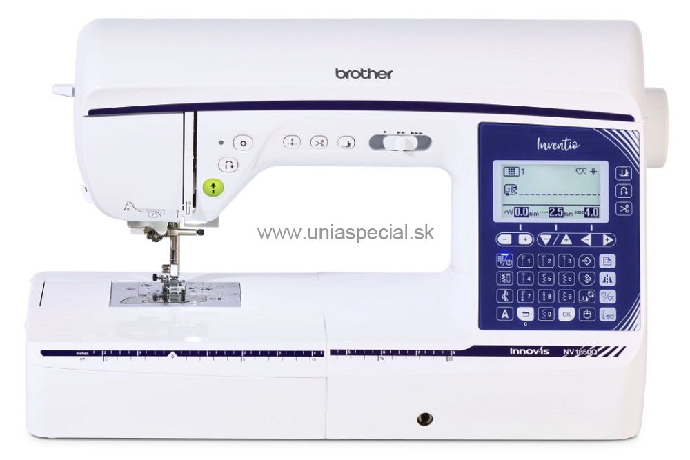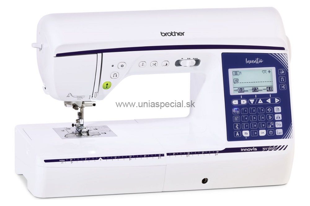 Šijací a quiltovací stroj Brother Inventio NV1850Q je elektronický šijací stroj, ktorý disponuje aj českým menu. Obsahuje 232 druhov stehov vrátane overlockových, dekoračných, patchworkových, 10 typov automatickej gombíkovej dierky. Možnosť tvorby vlastných stehov. Horizontálny rotačný chapač, ICAPS - systém automatického prítlaku pätky, automatické napätie vrchnej nite, navliekač nite do ihly, automatický odstrih nití, kolenná páka pre zdvih pätky kolenom. Veľká pracovná plocha - až 21 cm od ramena po ihlu, možnosť polohovania ihly hore a dole, tlačítko štart/stop na šitie bez pedálu.