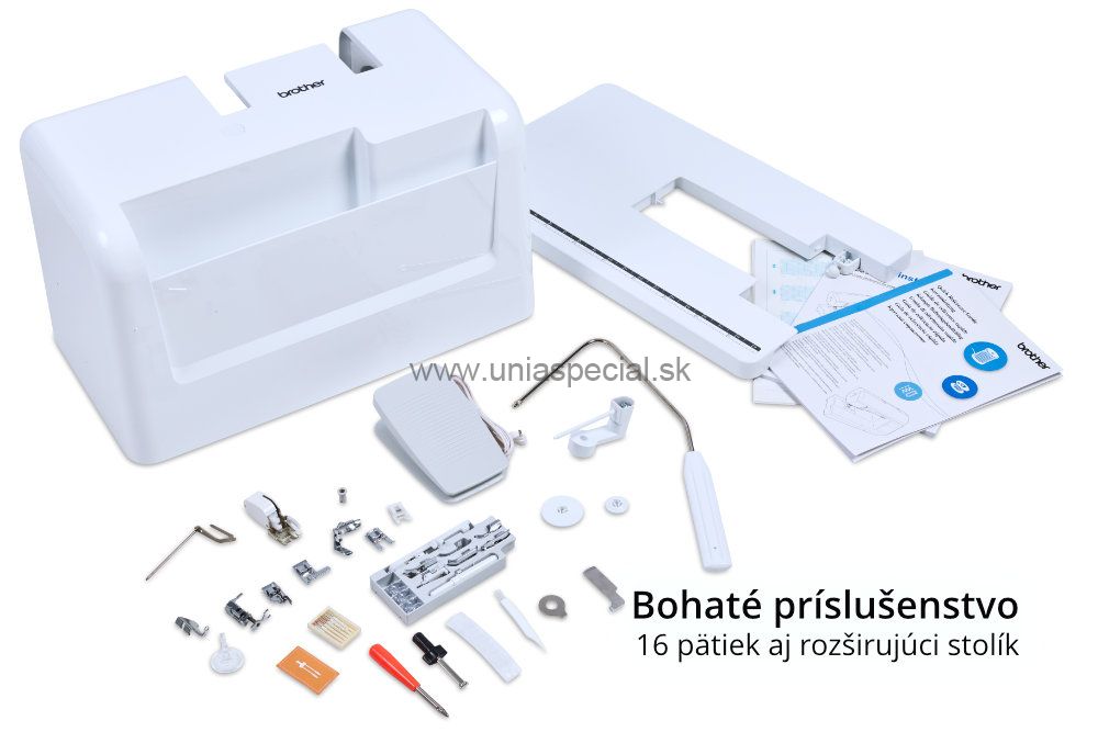 Samozrejmosťou je voľné rameno pre šitie nohavíc a rukávov, robustné celokovové telo stroja, ergonomicky umiestnené tlačítka, možnosť vypnutia zúbkov podávania pri plátaní a quiltovaní, LED osvetlenie, rýchla výmena pätiek jednoduchým nacvaknutím. Brother používa moderné tiché rotačné chapače, ktoré sa jednoducho čistia, niť založíte rýchlo a počas šitia cez priehľadnú krytku vidíte, koľko nite vám ešte zostáva na cievke. V priehradke na príslušenstvo nájdete praktický organizér na pätky, takže máte všetko pripravené.