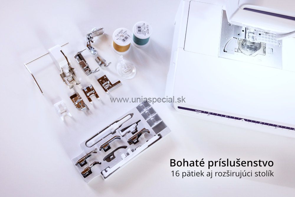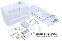 V základnej výbave stroja je stolík pre rozšírenie pracovnej plochy stroja, kolenná páka a celkom 16 pätiek na šitie odevov, patchworku aj bytových dekorácii. S kolennou pákou a automatickým odstrihom nite sa vám budú skvele šiť kabelky.