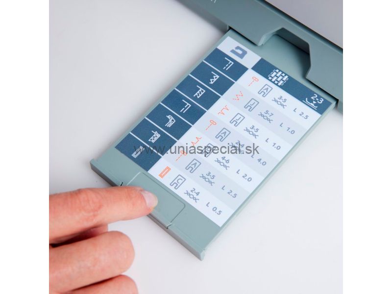 - Praktická vysúvacia tabuľka s nastavením stehov, pätiek a odporúčaných prítlakov pätky