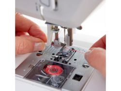 - Možnosť schovania podávania – šitie vo vyšívacom rámčeku (bez podávania), plátanie, prišívanie gombíkov