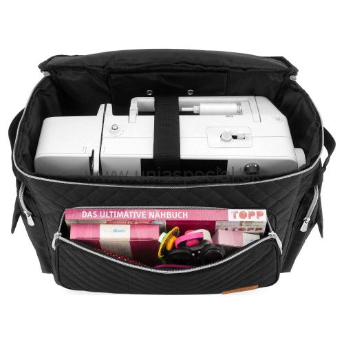 Vysoko kvalitný, odolný a polstrovaný vonkajší materiál, robustná pevná zadná stena a pevné, stabilné dno s dvoma plastovými nožičkami zaisťujú spoľahlivú ochranu vášho šijacieho stroja. Ďalšie vlastnosti ako sú pohyblivá prepážka vo vnútri, stabilná teleskopická tyč s pevnou rukoväťou, dve široké kolieska s guličkovými ložiskami a pevné bočné držadlá, uľahčujú pohodlnú prepravu. Praktické sú tiež veľké vonkajšie vrecká, bočné vrecká na zips a priehradky na uloženie príslušenstva.