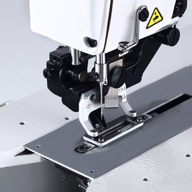 Zmontovaný, kompletný priemyselný šijací stroj vrátane podstavca so zabudovaným servomotorom o výkone 550W (napájanie 230V), stroj je pripravený k okamžitému šitiu.