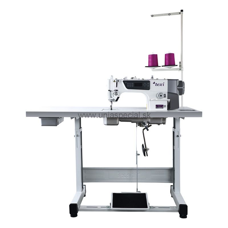 1-ihlový priemyselný šijací stroj so stehom viazaným pre šitie ľahkých až stredne hrubých materiálov, spodné podávanie, automatický odstrih nití, elektromagnetický zdvih pätky, zapošívanie s programovaním na panelovom displeji, zabudované LED osvetlenie pracovnej plochy stroja, otvorený centrálny mazací systém. Kompletný stroj s podstavcom a AC servomotorom zabudovaným v hlave stroja. Pripojenie 230 V. Možnosť nastavenia pozície ihly pri zastavení stroja (dolu / hore).