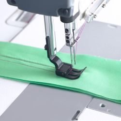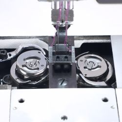 2-ihlový šijací stroj s viazaným stehom pre jemné a stredne hrubé materály, spodné + ihlové podávanie. Kompletný stroj s podstavcom a AC servomotorom zabudovaným v hlave stroja. Pripojenie 230 V. Možnosť nastavenia pozície ihly pri zastavení stroja (dolu / hore), zabudované LED osvetlenie pracovnej plochy. Maximálna rýchlosť šitia 3000 stehov/min, max. dĺžka stehu 5 mm, centrálne mazanie (otvorený systém), výška zdvihu prítlačnej pätky 7-10 mm.