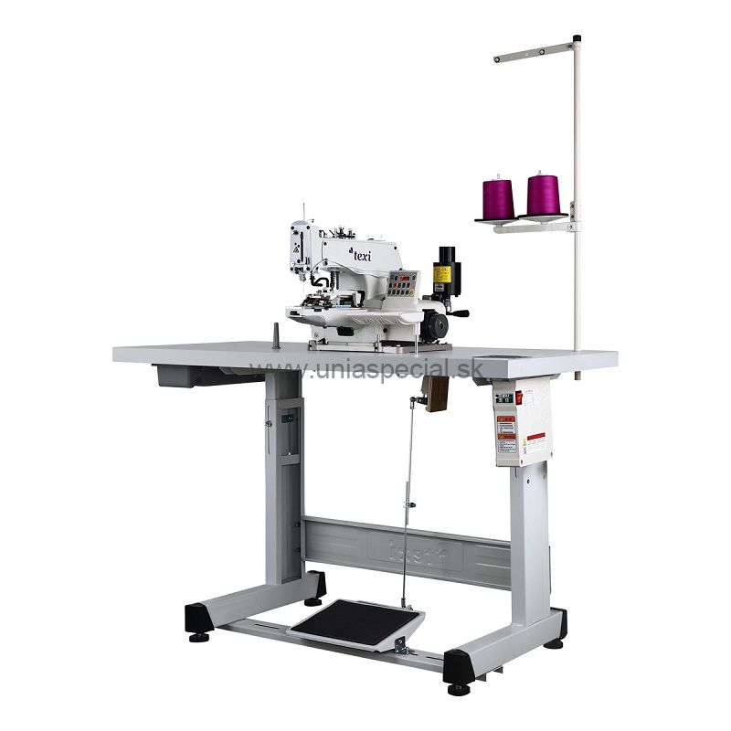 1-ihlový gombíkovací stroj so zabudovaným servomotorom v hlave stroja a ovládacím LCD panelom na doske stola, stroj šije retiazkovým stehom, súčasťou je odstrih nite, môže prišívať 2 a 4 dierkové gombíky do kríža rozmeru od 10 do 28mm, alebo prišívanie paralelnou metódou, nastaviteľný počet stehov je možný na display, ktorý je súčasťou zariadenia, komplet s výškovo nastaviteľným podstavcom, doskou s ergonomickou prednou hranou, zabudovaný servomotor, zásuvka na náradie. Stroj je osadený štandardne držiakom na prišívanie plochých gombíkov. Rozostup dier gombíku 2,5 - 6,5mm.