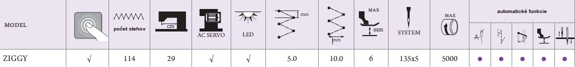 Elektronicky riadený 1-ihlový stroj s cik-cak stehom, plochý stroj so spodným podávaním. Oproti mechanickým strojom má výhodu, že nie je potrebné meniť mechanické vačky pre zmenu vzoru šitia. Je perfektný pre rovné šitie, štandardný cik cak, 2-zápich, 3-zápich a ostatné dekoratívne stehy. V šijacom stroji je uložených 114 základných stehov s možnosťou úprav a konfigurácií. Predĺžené rameno stroja, kde je priestor medzi ramenom a ihlou 29 cm. Stroj je vybavený odstrihom nití, programovateľným zapošitím, automatickým zdvihom pätky a odťahom nite po odstrihu.