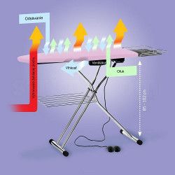 Veľkosť pracovnej dosky 120 x 46 cm, regulácia výšky žehliacej dosky 85-102 cm, príkon vyhrievania povrchu žehliacej plochy 400 W, príkon odsávania / ofuku 90 W, odkladacia plocha pre malý vyvíjač pary.