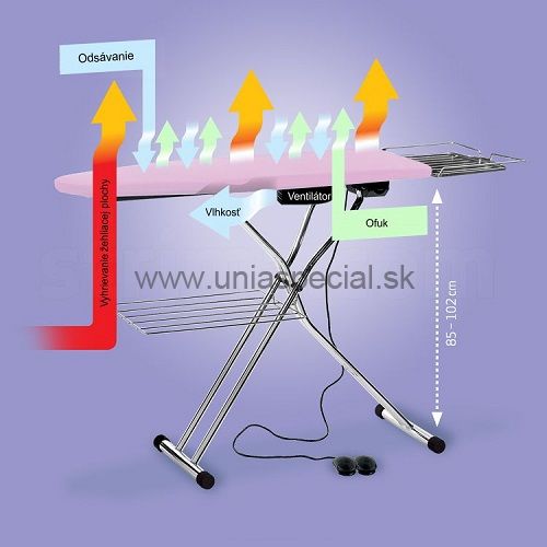 Žehliaca doska, skladacia, pochrómovaný stojan, regulácia výšky, odsávanie, ofuk.